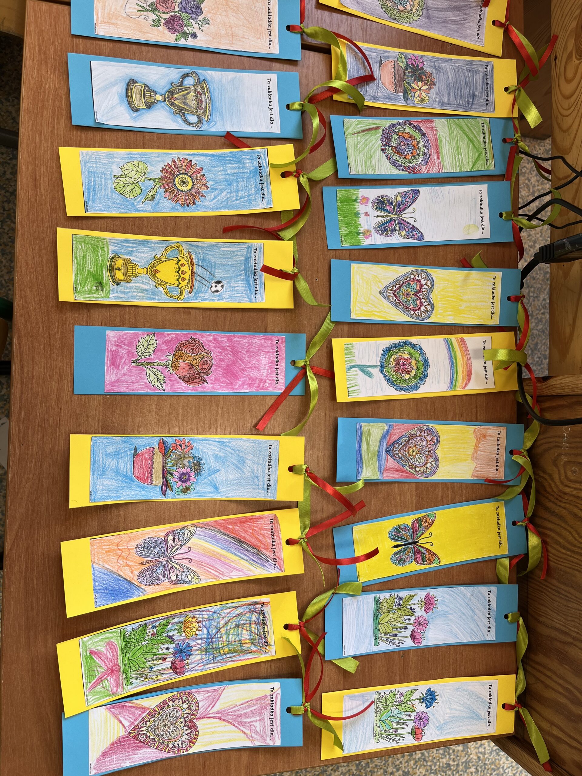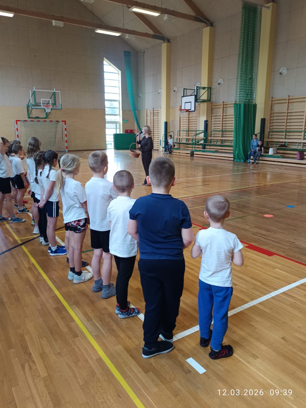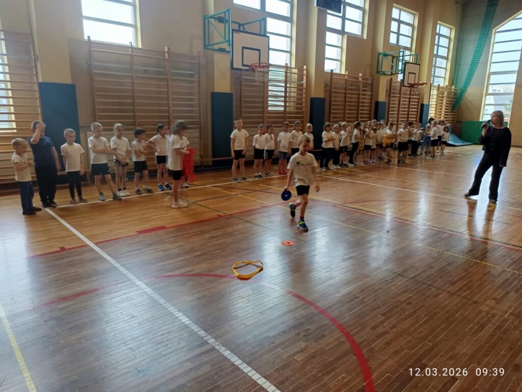 Dla najmłodszych gości uczniowie klasy 1b przygotowali zajęcia wychowania fizycznego. Po serdecznym powitaniu wszyscy uczestnicy rozpoczęli spotkanie od muzycznej rozgrzewki do piosenki „Clap Clap Song”, która wprowadziła dzieci w radosny i pełen energii nastrój. Następnie przedszkolaki wzięły udział w różnych zabawach ruchowych, między innymi w berka przy akompaniamencie muzyki. Kolejnym punktem zajęć były wyścigi rzędów – zadaniem drużyn było zgromadzenie jak największej liczby kolorowych talerzyków, znalezienie skarbów pod talerzykami. Zabawy wzbudziły wiele emocji, a dzieci z ogromnym zaangażowaniem rywalizowały ze sobą, jednocześnie świetnie się bawiąc. Na zakończenie spotkania przedszkolaki otrzymały upominki – zakładki do książek, które zostały własnoręcznie wykonane przez uczniów klasy 1b.